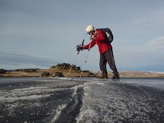 won't last. Track messy when it thaws. Idaburn 60-70mm snow ice in main basin - thins out to water in the gorge side. Hard and bumpy while frozen. Need frosts!! The ice does not feel as though it is here to stay and unfortunately warmer weather and winds are due. ![]() Cracks appearing at Poolburn as the day warms. Photo by Dave Young ![]() Testing before crossing pressure cracks in the ice. Photo by Dave Young |