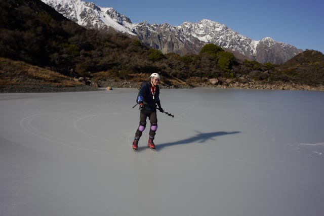 Thick fast snow ice softening after midday. No ice on the Tasman Glacier Lake, small pockets of ice on Muller Lake and Hooker Lake ![]() Mark Easton on the Blue Lake, Photo Alan Knowles |