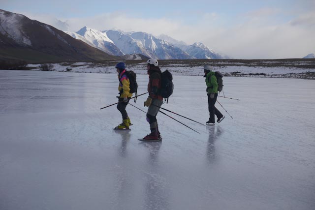 ice is fast and hard with 2mm snow. Lake Clearwater has open water denying ice access to east end. Good ice elsewhere. Lake Camp level rose in rain last week and a huge area of open water bisects lake. Access to ice difficult because of moat. Eastern open water and too dangerous. Lake Emma, road access good, good skating at Western end. ![]() Neil Harding Roberts, Mark Easton and Annette on Lake Clearwater Photo Alan Knowles |