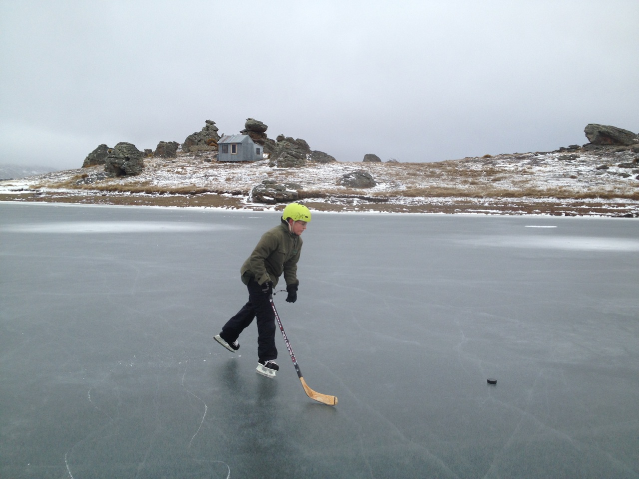 edges re-frozen, some melt/open areas around rocks in the lake. Track: snow covered near the top, four wheel drive needed. ![]() Tomas Whelan-Henderson showing his hockey skills Photo by Doug Henderson |