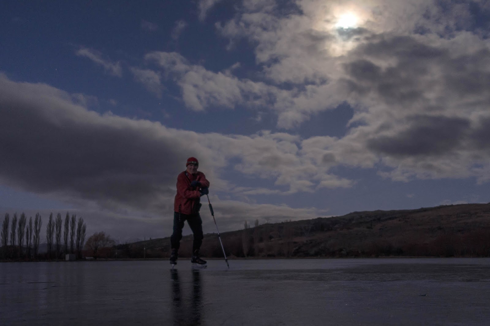 skating. Weak and some water at the edge. Ice feels "old"![]() Moonlit Skate on Idaburn Dam. Photo by Dave Young. |