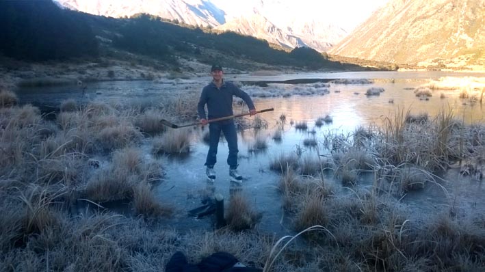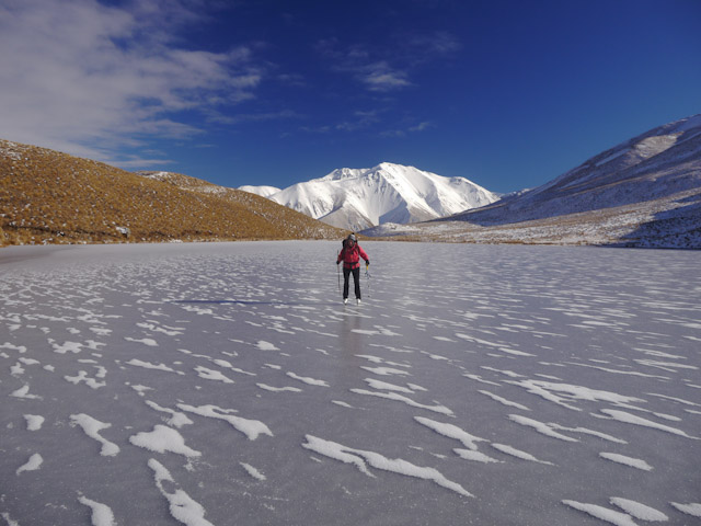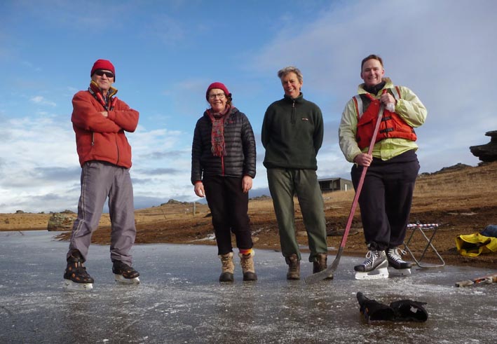 at least -7deg tonight and that it will be skatable tomorrow. Editors note: Currently the 1st gate to Ida and Olympus Ski field is locked and its about an hour walk to Lake Ida from the car park between Lake Evelyn and Lake Self. ![]() Alan Knowles on Lake Ida photo Barbara Thomson |