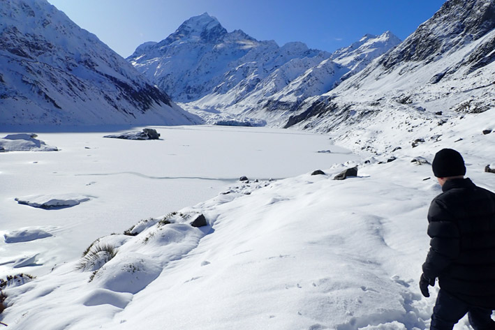 | Mt Cook, It hasn't been cold enough yet for ice to form on the Glacier Lakes, a little ice on Hooker but none on Tasman. | |